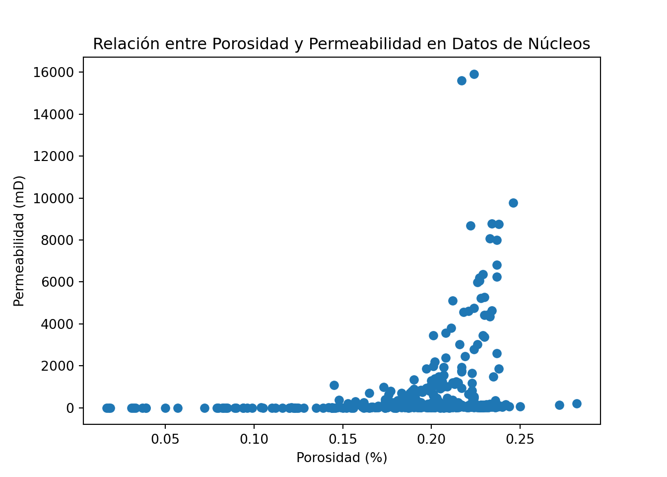 Ejemplo de grafico de dispersión usando datos porosidad y permeabilidad de núcleos de un yacimiento petrolero