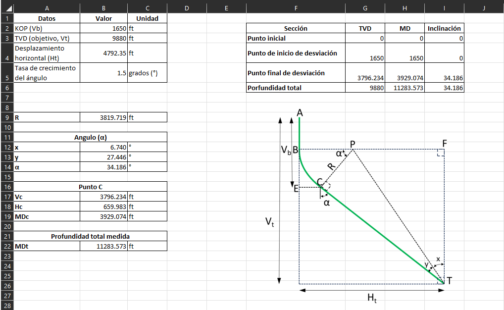 En el siguiente enlace encontraras una hoja de cálculo de Excel para estimar las coordenadas necesarias para construir una trayectoria de un pozo tipo J