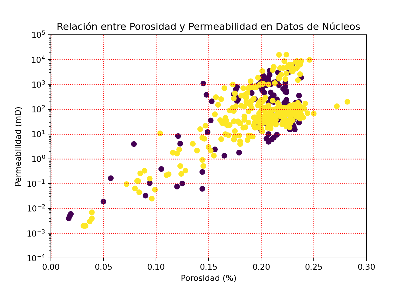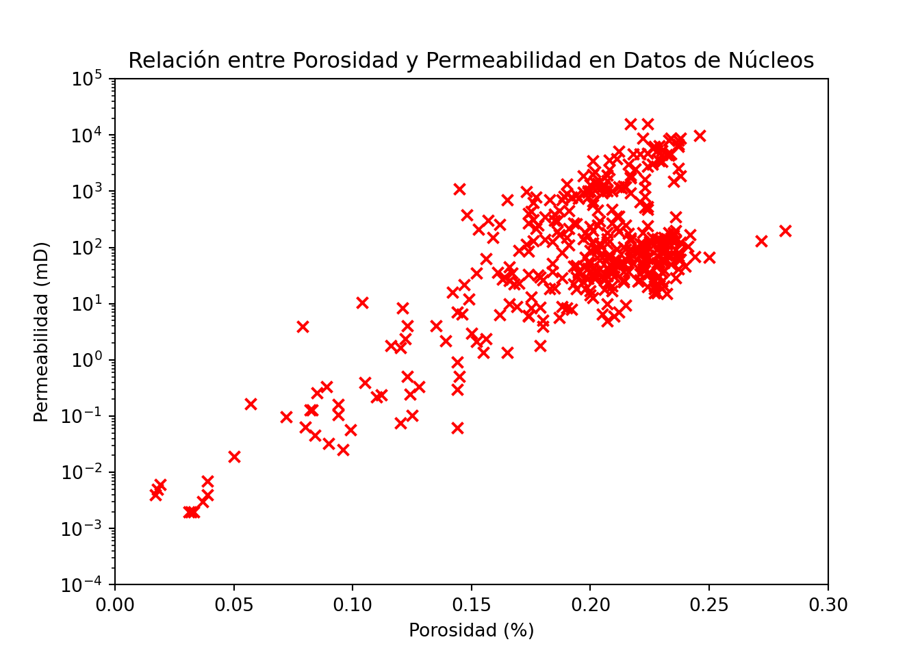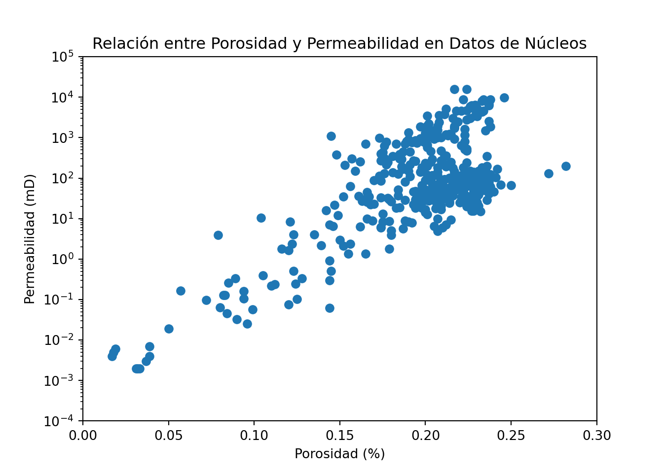 Este código generará un gráfico de dispersión básico, con el título y nombre de los ejes personalidos. Observamos que debido al comportamiento logaritmo de la permeabilidad los datos se ven agrupados en valores bajos de esta propiedad. Para ello cambiaremos la escala del eje y por una escala logarítmica y limitaremos los ejes en un rango mínimo y máximo
