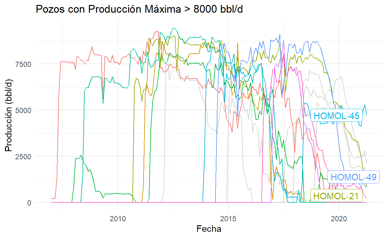 labs(title = "Pozos con Producción Máxima > 8000 bbl/d",