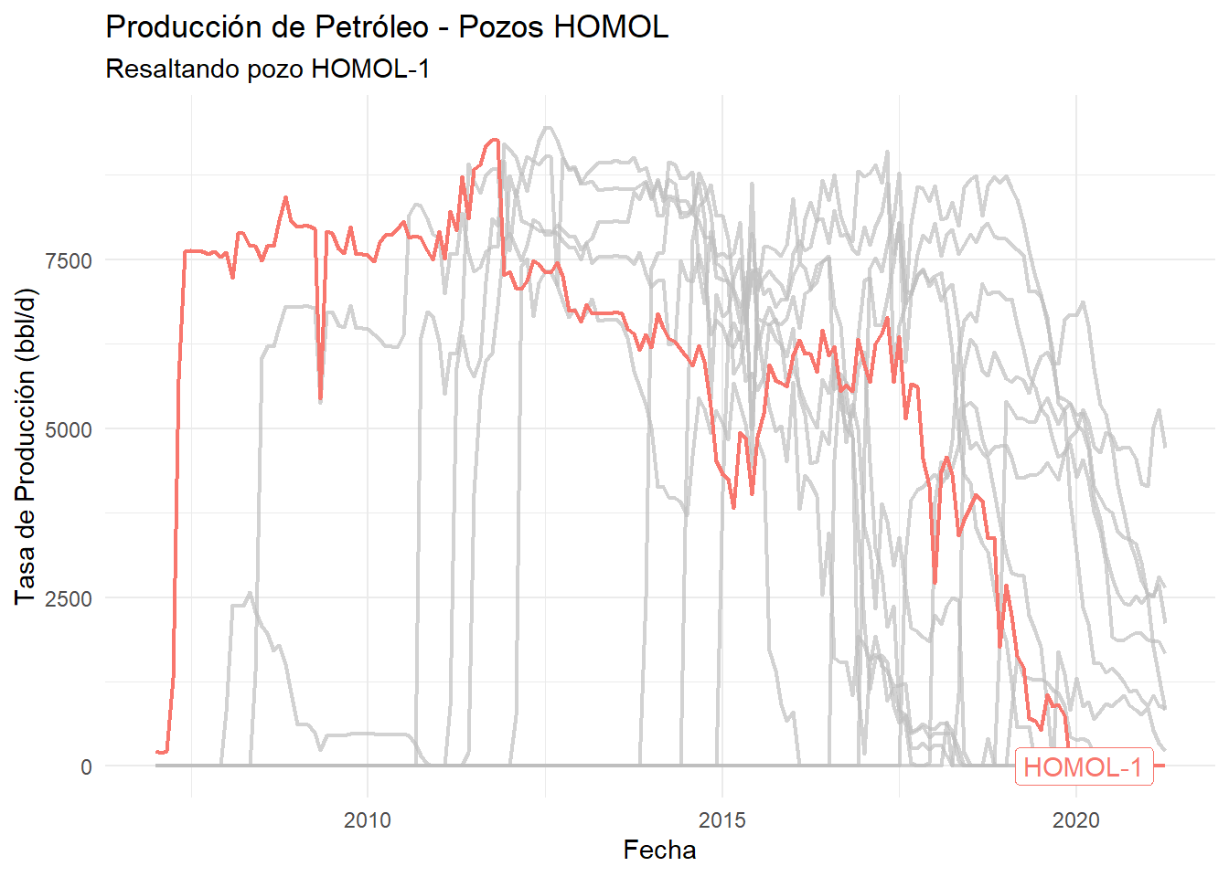 Resaltaremos la producción de petróleo del pozo HOMOL-1 para compararla visualmente con otros pozos.