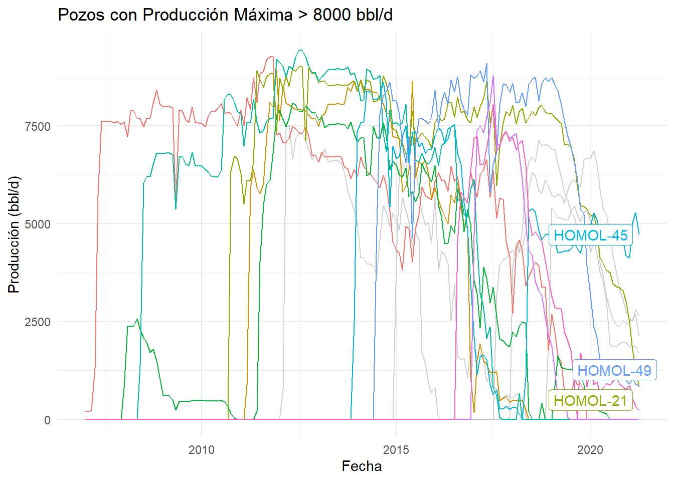labs(title = "Pozos con Producción Máxima > 8000 bbl/d",